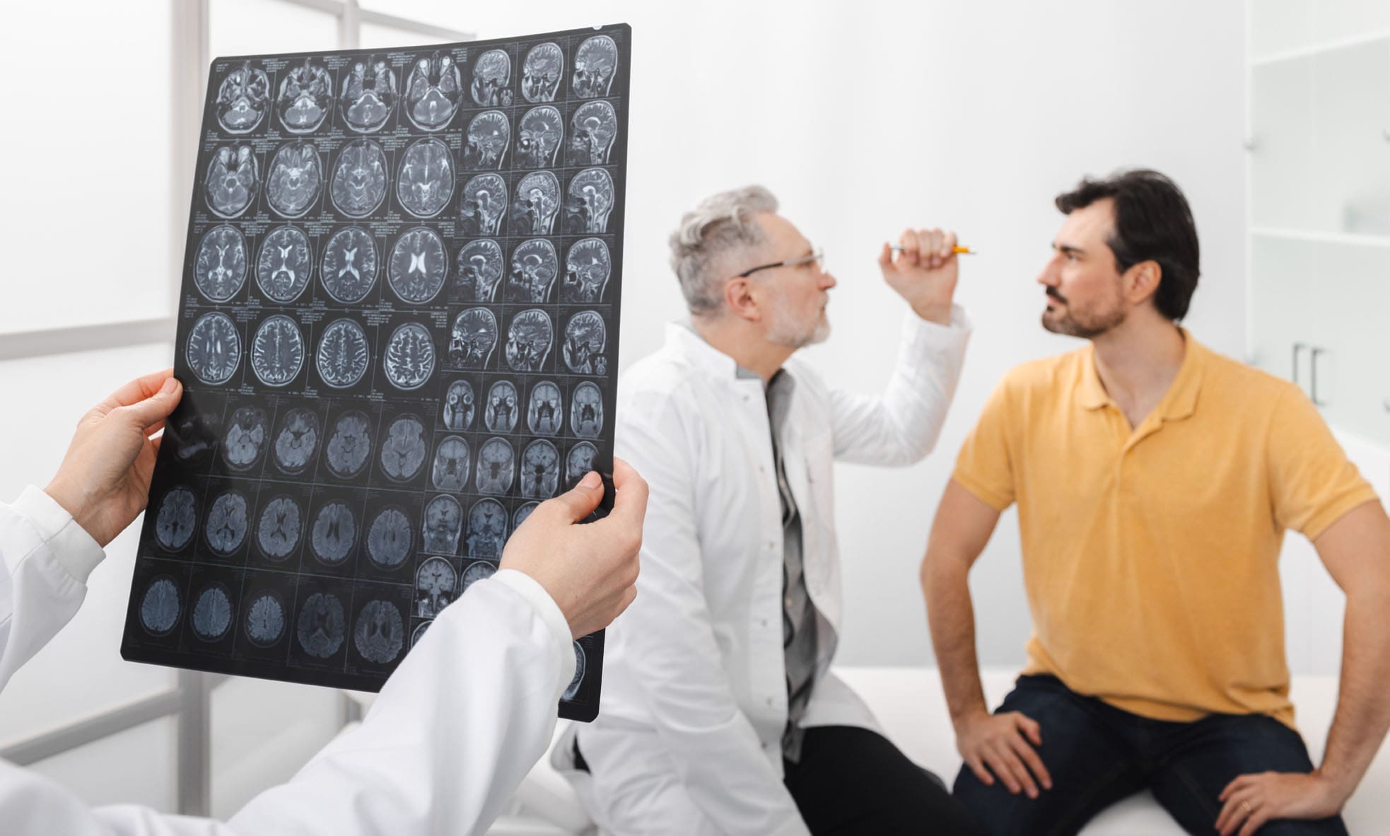 The doctor presents the patient with questions about traumatic brain injuries.